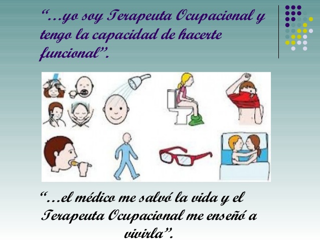 "Terapia ocupacional es una profesión de las ciencias de la salud que provee servicios a los individuos cuya capacidad para funcionar en su vida cotidiana está alterada como consecuencia de enfermedad o daños físicos, de problemas del desarrollo, del proceso de envejecimiento, de enfermedades mentales o problemas emocionales.